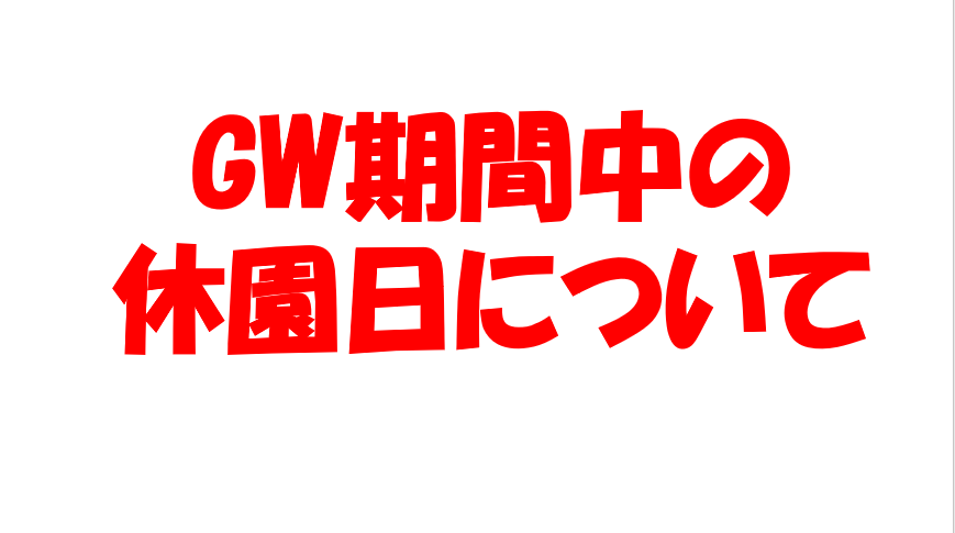 ゴールデンウイーク期間中の休園日について 2024.04.29 ゴールデンウイーク期間中、4月30日(火)は休園日になります。 また、ゴールデンウイーク明けの5月7日(火)も休園になりますので、 お間違えのないよう、よろしくお願いいたします。